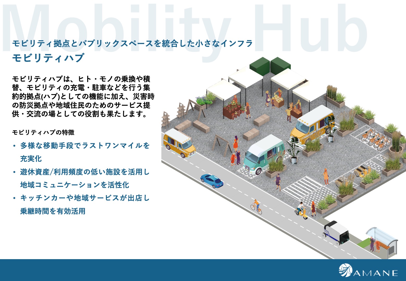 モビリティハブは交通結節点と公共スペースを統合した小さなインフラです。ヒト・モノの乗換や積替、モビリティの充電・駐車などを行う集約的拠点(ハブ)としての機能に加え、災害時の防災拠点や地域住民のためのサービス提供・交流の場としても機能します。
