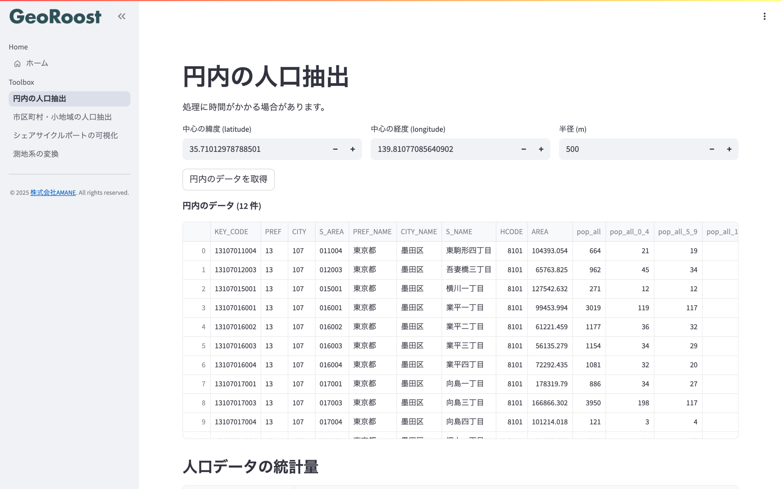 - 任意の円内の人口抽出