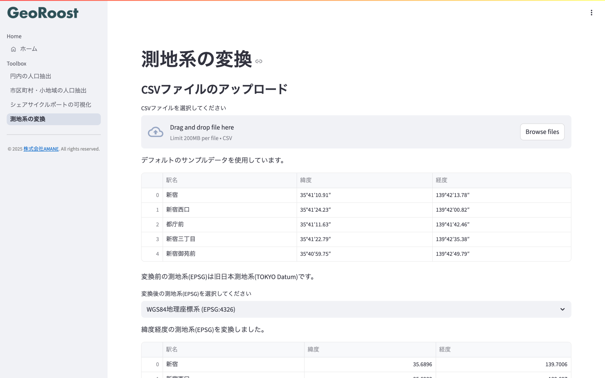 - 施策:データを10進数表記に変換し、測地系をWGS84地理座標系に変換。