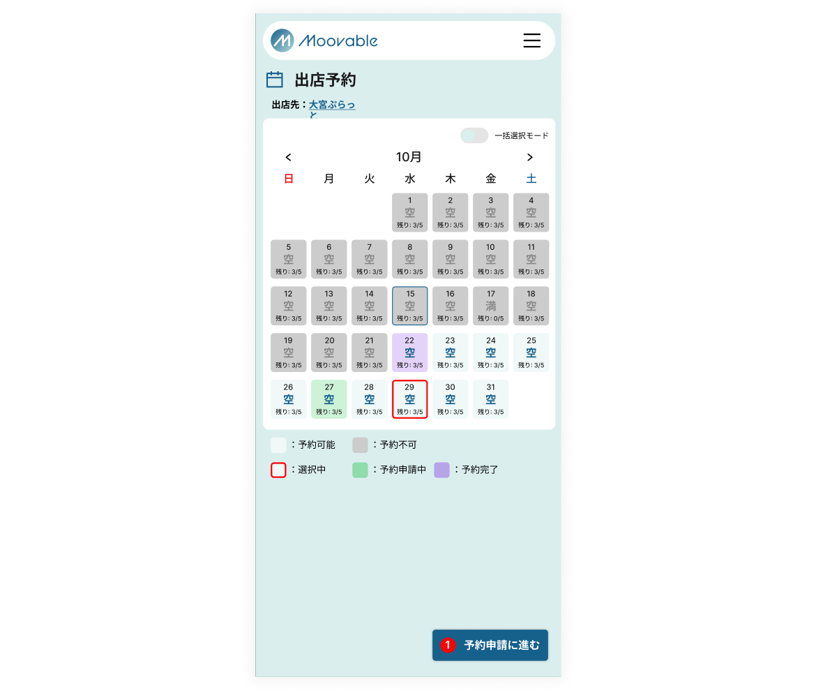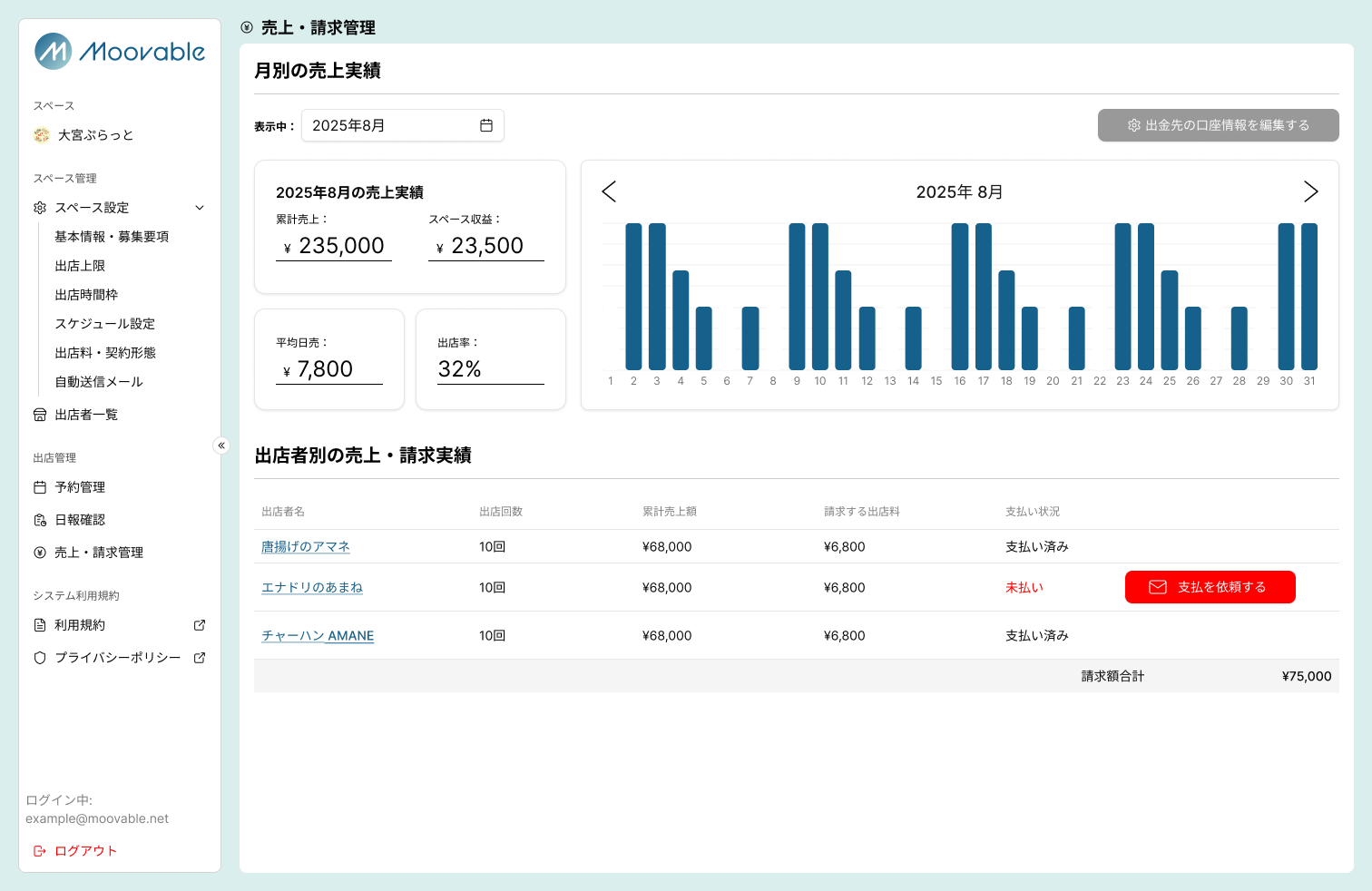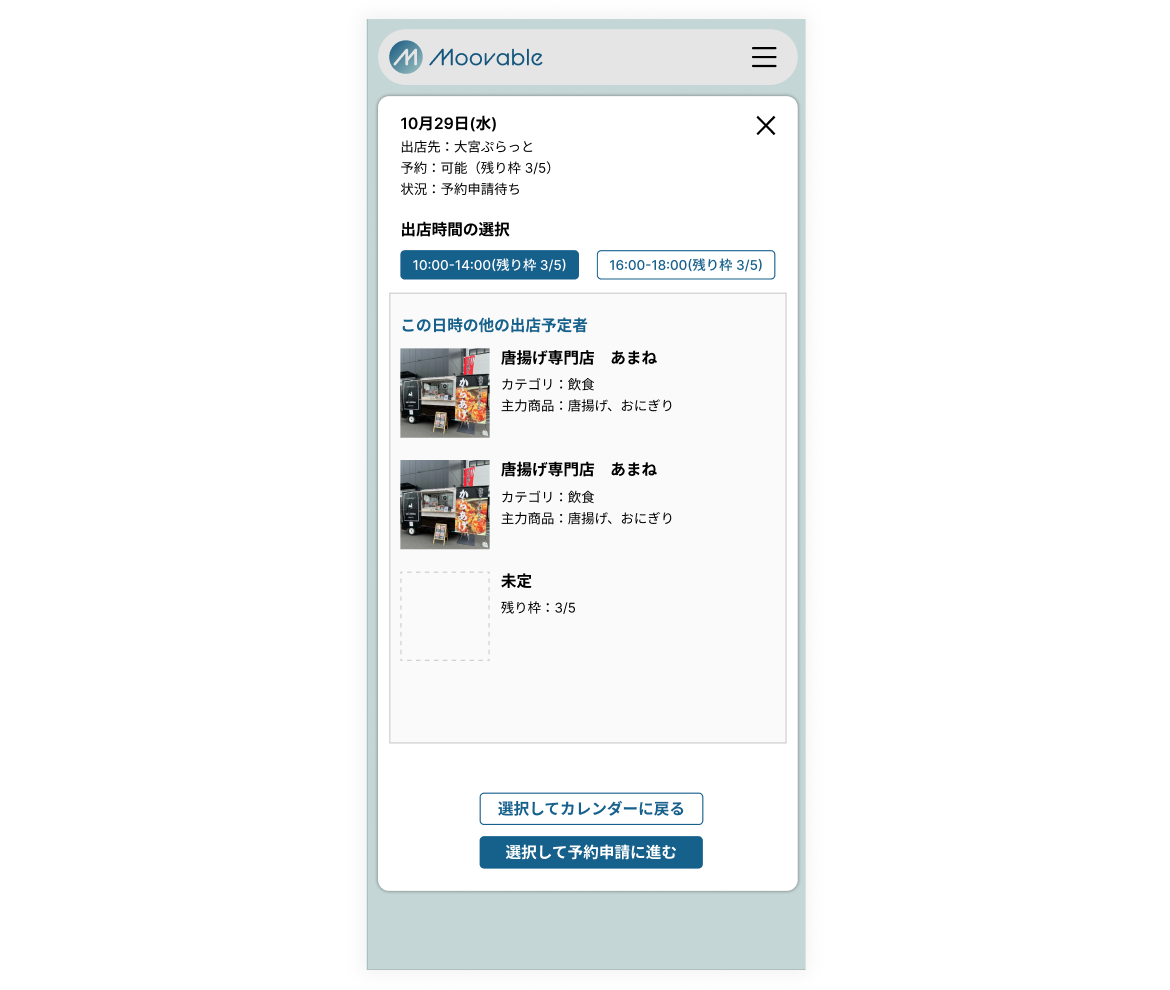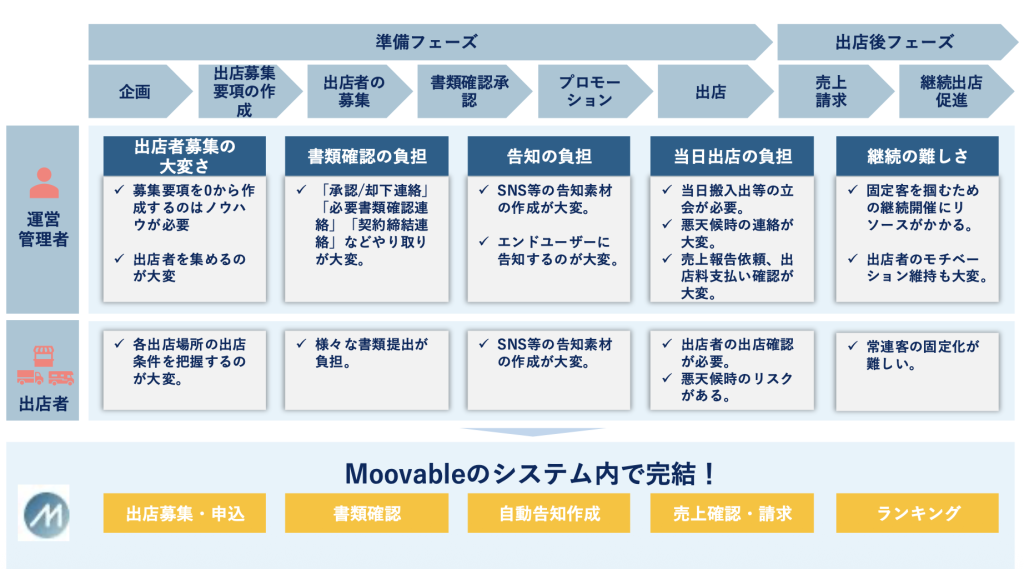 Moovableでは、このような出店者同士の接点づくりや煩雑な手続きを効率化し、マルシェ継続開催のハードルを下げることができます。