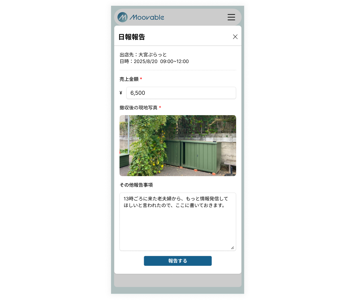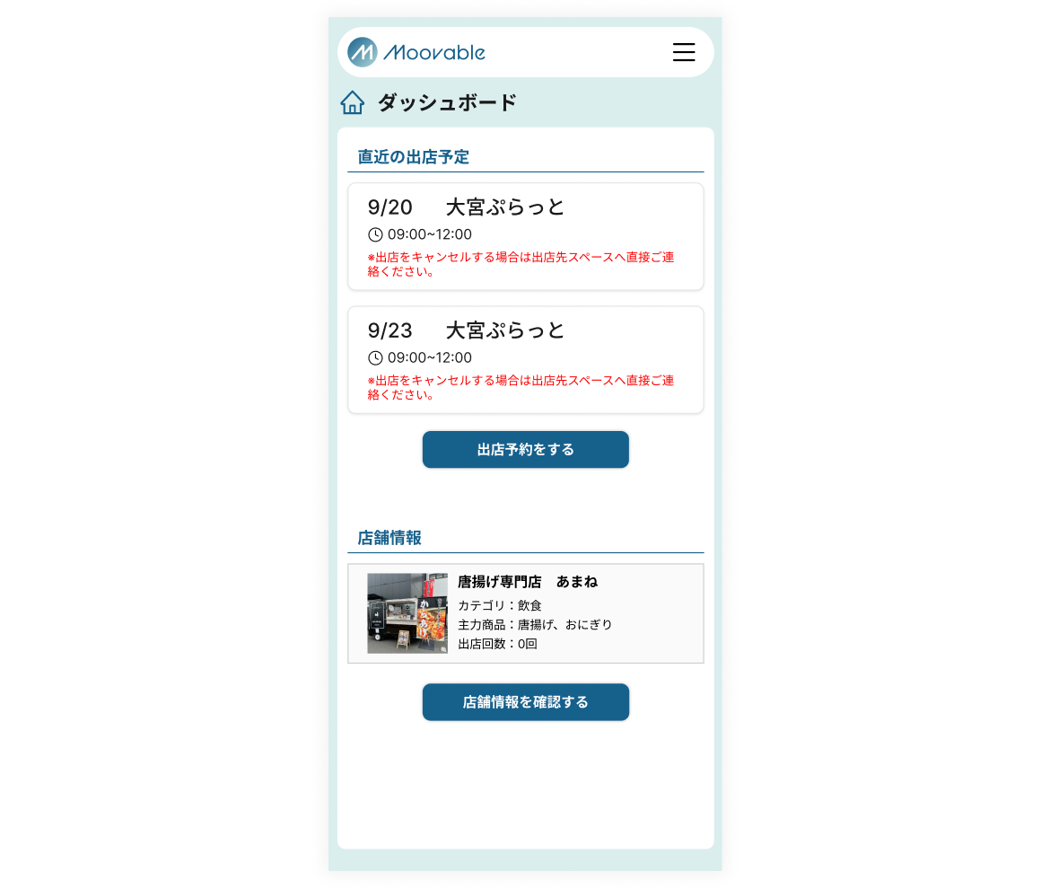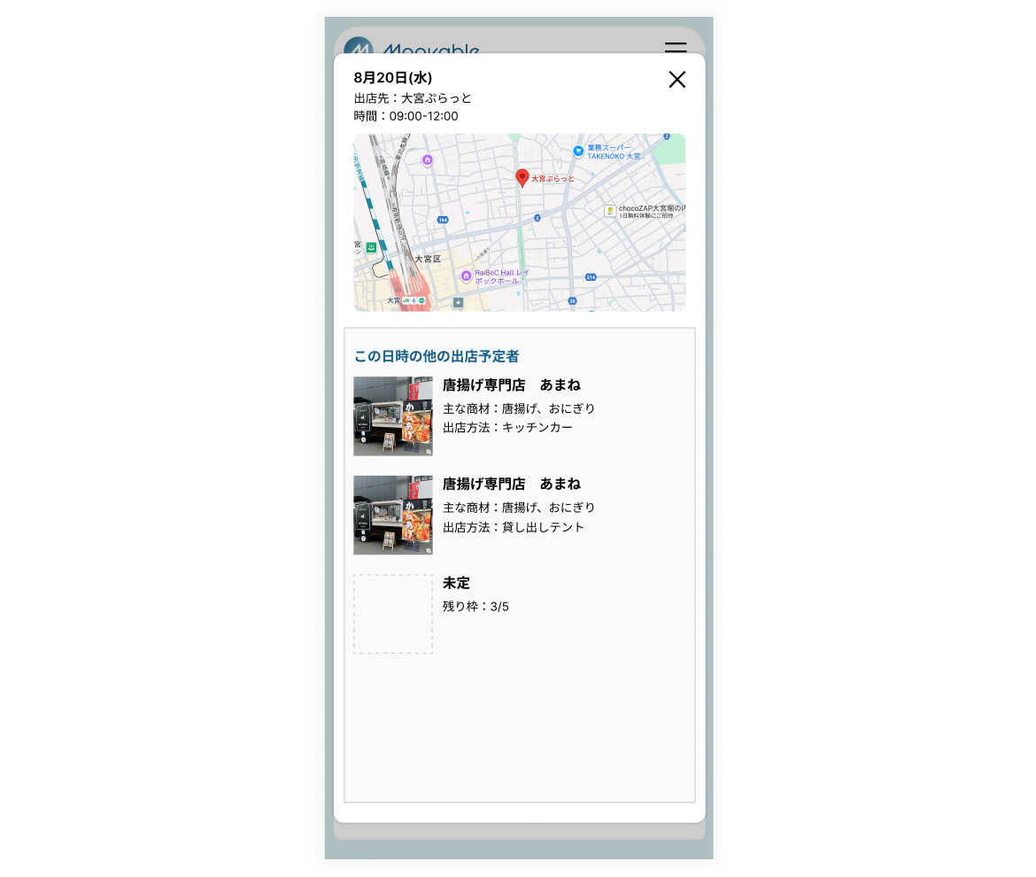 Moovableは、キッチンカー、トレーラーハウス、屋台等の「可動産」を誰もがマネジメントできるようになるツールです。